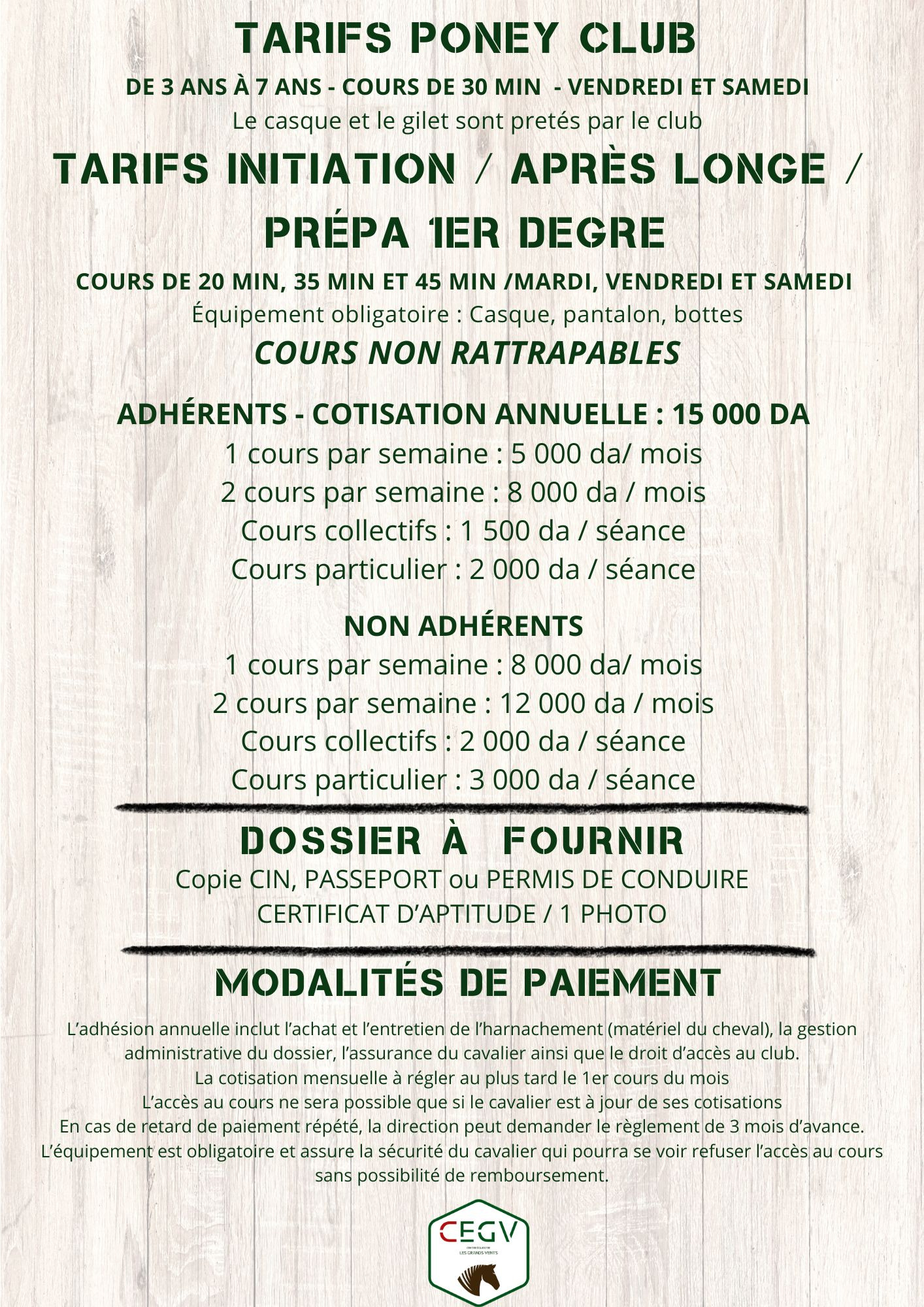 Examens fédéraux des 1er et 2ème degré, concours de saut d'obstacles, endurance, dressage, ou juste pour le plaisir de monter, des cours pour les cavaliers plus expérimentés sont disponibles.