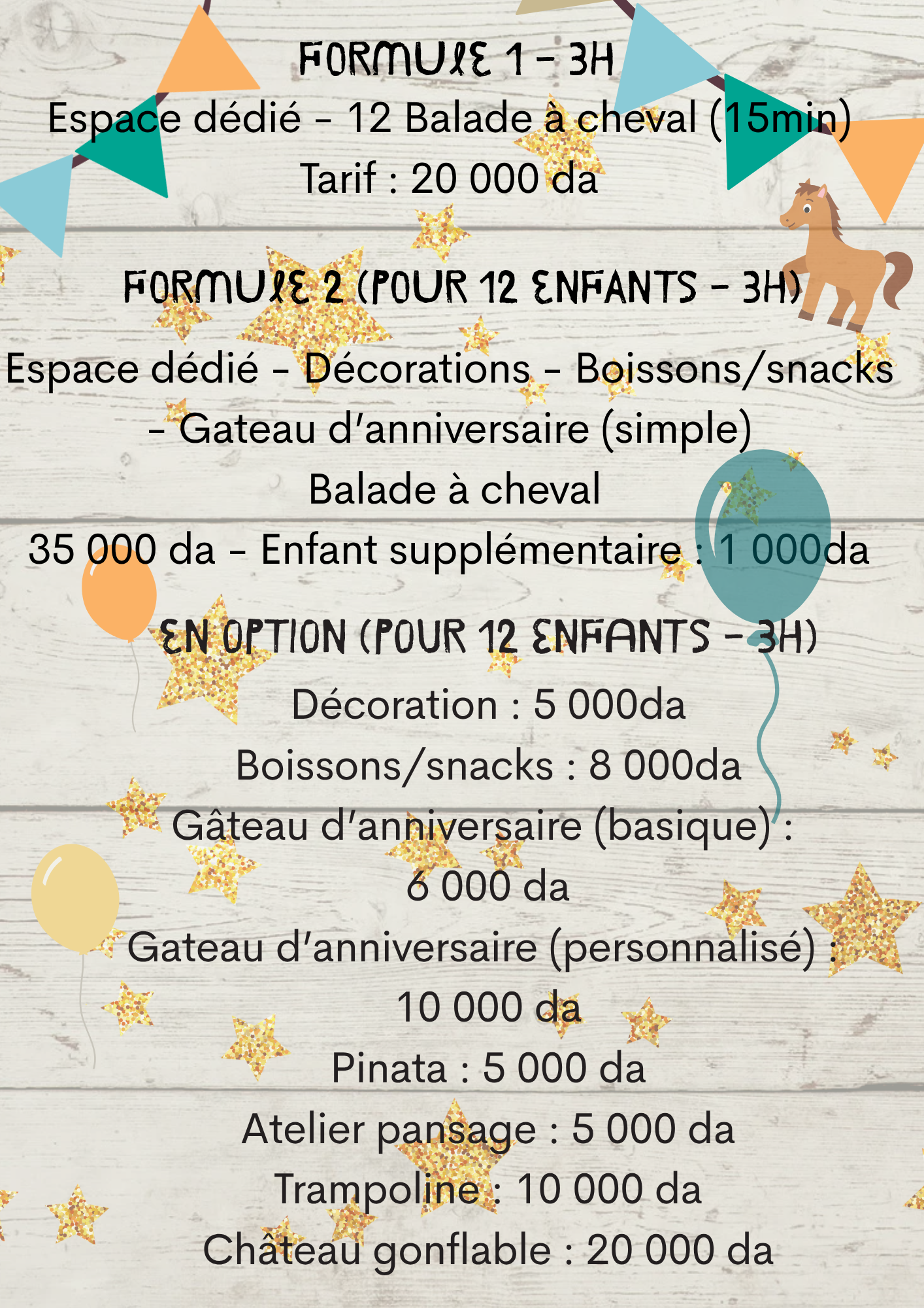 Nous organisons des fêtes originales dans un cadre unique. De nombreuses activités sont au programme : château gonflable, pinata, chasse au trésor et bien sur balades à cheval !